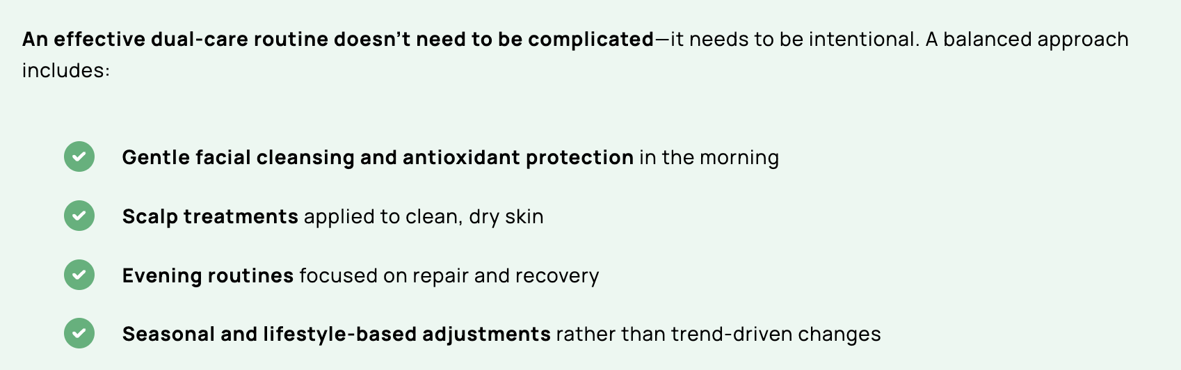 The key is to treat skin and scalp as connected—but not identical. Facial aging benefits from protective care and collagen-supporting formulas, while scalp aging requires targeted barrier support and follicle-focused treatments. When barrier repair connects both, the result is a thoughtful routine that supports long-term skin health, scalp comfort, and resilient hair at every stage of aging.